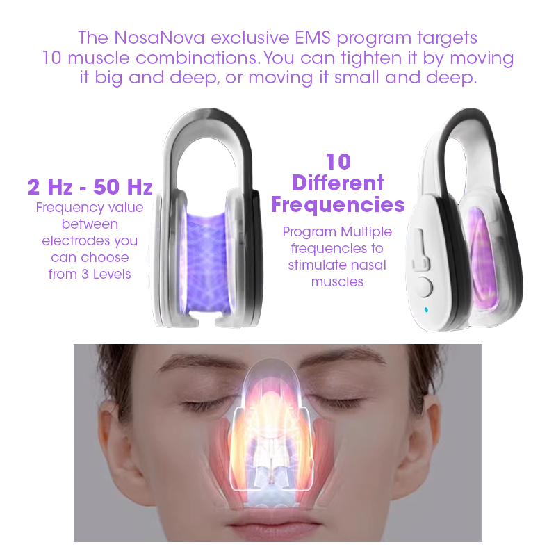 Our device revolutionizes nasal muscle conditioning with cutting-edge EMS technology, boasting a lineup of 10 frequencies (ranging from 2 Hz to 50 Hz). It ensures a snug and secure fit, allowing you to concentrate on efficient and effective muscle conditioning. With just a 10-minute daily self-care session, based on research from over 100 individuals, you'll experience a visibly healthier, more harmonious nose appearance.